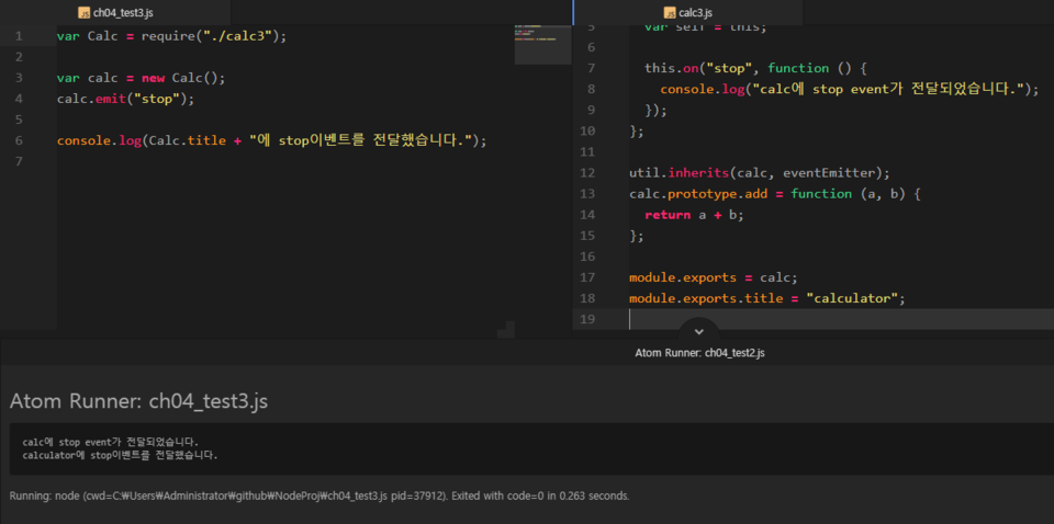 - emit() 메소드를 이용하면 모듈로부터 이벤트를 전달받을 수 있다.