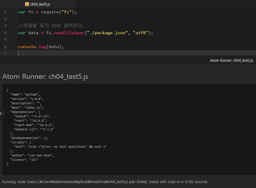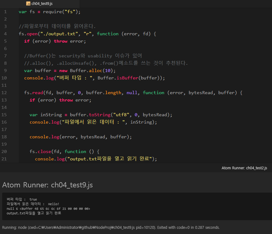 - 동기식 파일 출력이며 readFileSync 메소드를 이용한다.
