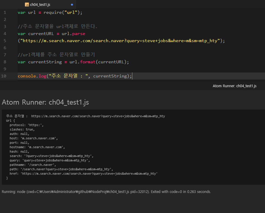 - 주소 문자열은 단순 문자열이기 때문에 어디까지 사이트 주소이며 요청 파라미터인지 구별해아 한다. 이 작업을 쉽게 할 수 있도록 노드에서 미리 만들어둔 모듈이 url 모듈이다.