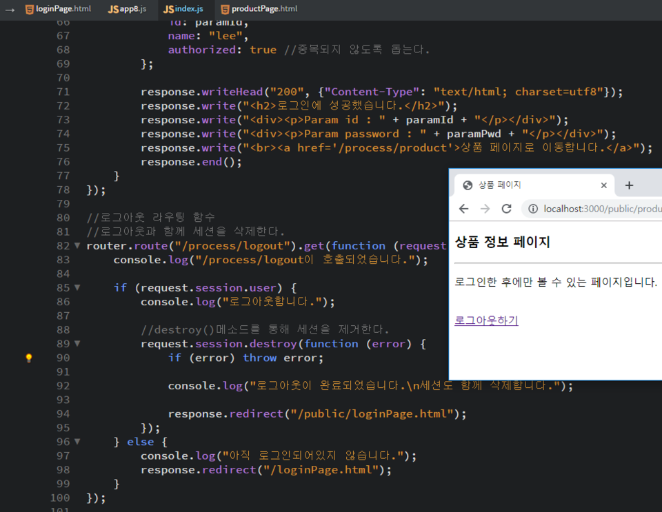 - 사용자가 로그인하면 세션이 생성되고 로그아웃하면 세션이 제거되도록 설정한다면 로그인된 사용자만 접근이 가능하도록 제한된 페이지를 만들 수 있게 된다.