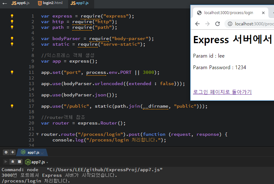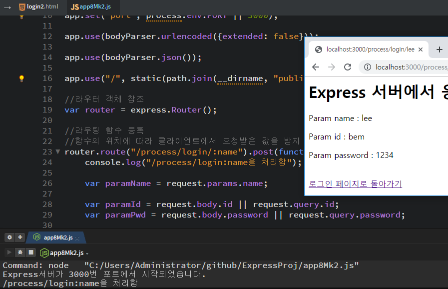 - /process/login:name을 통해 login 뒤에 오는 값을 파라미터로 처리하겠다고 선언하였으며, 이를 통해 지정한 파라미터는 request.params 객체 안에 들어가게 된다. 이런 방식으로 생성된 값을 토큰이라고도 부른다.