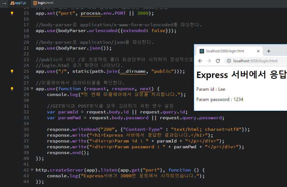 - body-parser 미들웨어는 POST로 클라이언트가 요청 파라미터를 보내왔을 때 이를 확인할 수 있도록 해준다.