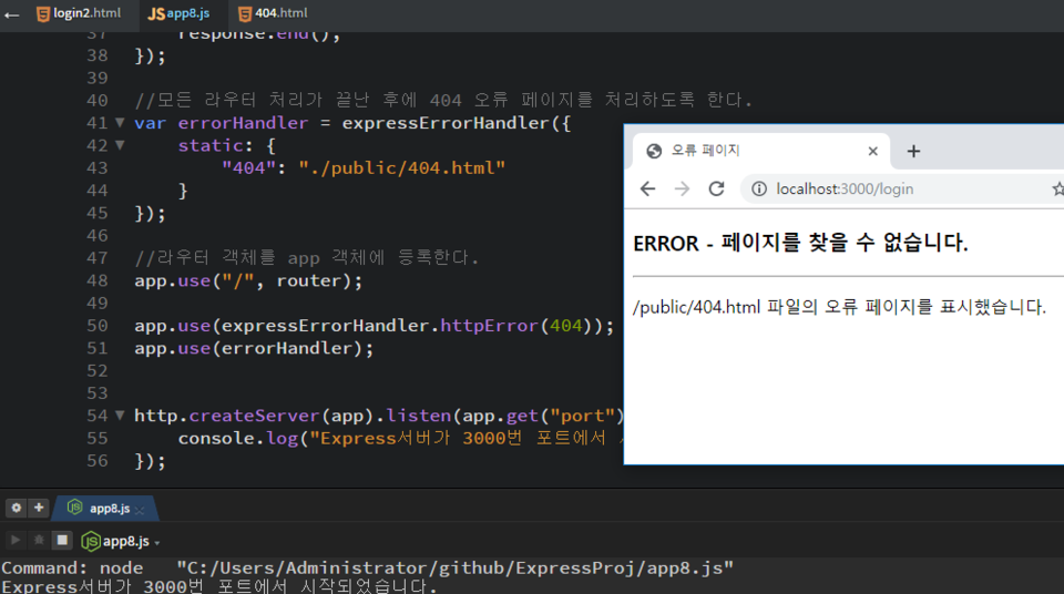 - 예상치 못한 오류를 처리할 수 있는 미들웨어도 있다. express-error-handler가 이 기능을 수행해준다.