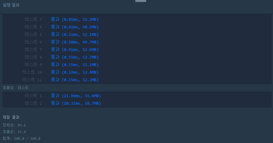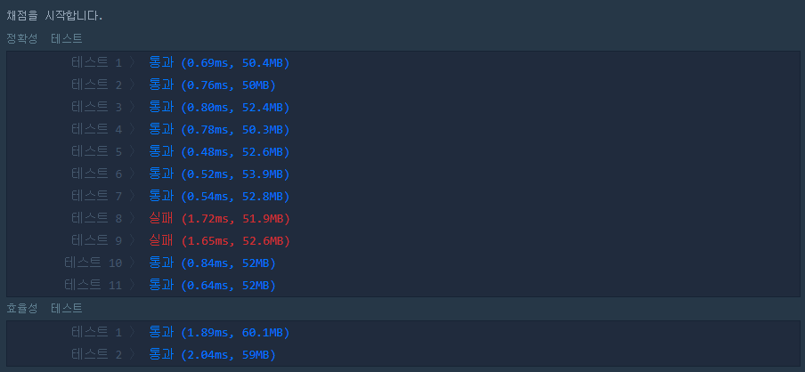 한 번의 반복문이였던 것을 두 번의 이중 반복문으로 수정하자 기본 예제는 정상적으로 해결되었다. 하지만 추가 예제 8번과 9번에 오류가 발생하여 완전한 코드는 아니라는 것을 알 수 있었다.