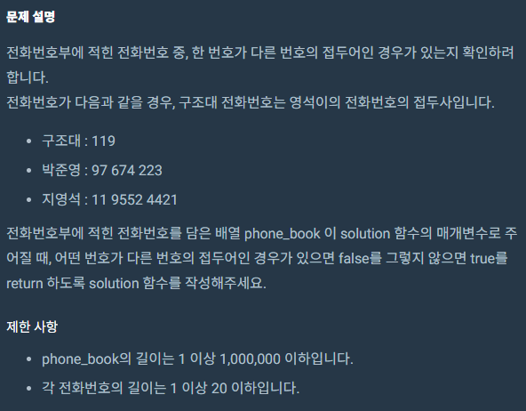 전화번호부에 적힌 전화번호 중, 한 번호가 다른 번호의 접두어인 경우가 있는지 확인하려 합니다. 전화번호가 다음과 같을 경우, 구조대 전화번호는 영석이의 전화번호의 접두사입니다. 구조대 : 119 박준영 : 97 674 223 지영석 : 11 9552 4421 전화번호부에 적힌 전화번호를 담은 배열 phone_book 이 solution 함수의 매개변수로 주어질 때, 어떤 번호가 다른 번호의 접두어인 경우가 있으면 false를 그렇지 않으면 true를 r