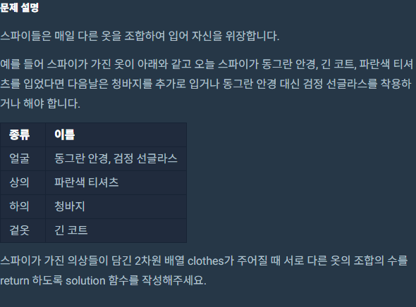 스파이가 위장을 위해 현재 가지고 있는 옷들을 매칭해 겹치지 않게 옷을 입을 수 있는 경우의 수를 구해야 하는 것이 문제의 요구조건이다.