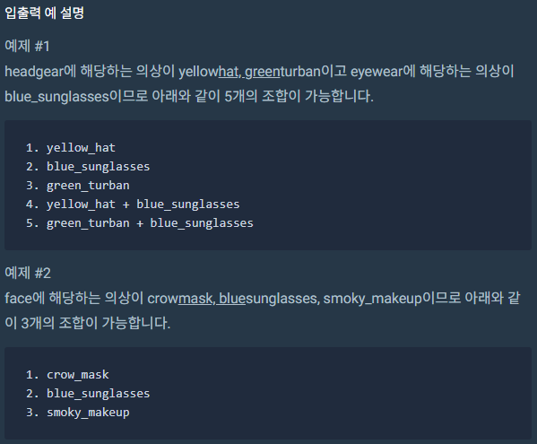 문제를 면밀히 분석해본 결과 이 문제는 순열을 이용해 푸는 문제라는 판단을 했고, 만일 headgear 2개와 eyewear 1개일 경우 5가 반환되는 것이 H, H, E, HE, HE의 다섯 가지이며 HH는 제외했다는 것을 알 수 있었다.