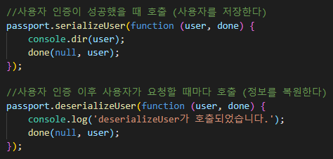 - 이 부분이 필요한 이유는 세션 저장과 복원이 패스포트 모듈이 아닌 다른 코드에서 처리하도록 되어있기 때문이다.