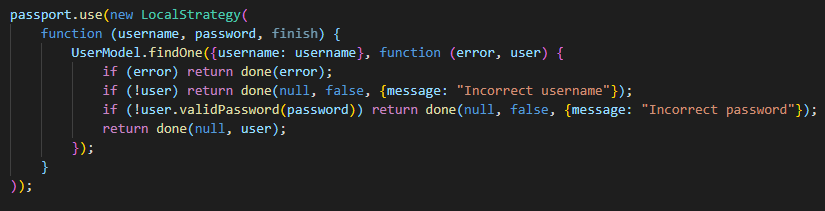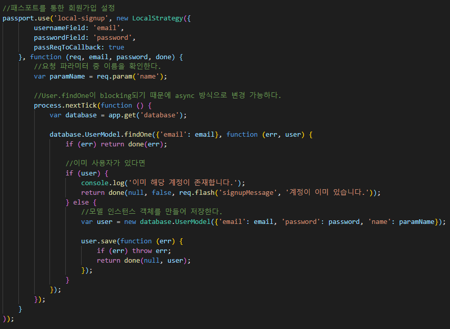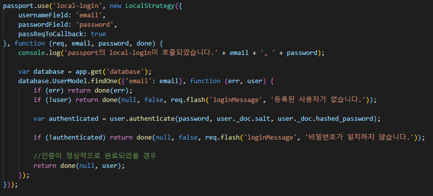 - 로컬 인증 방식을 사용하기 위해서는 passport-local 모듈을 먼저 설치해야 하며 LocalStrategy 객체를 사용하는 전형적인 코드는 아래와 같다.