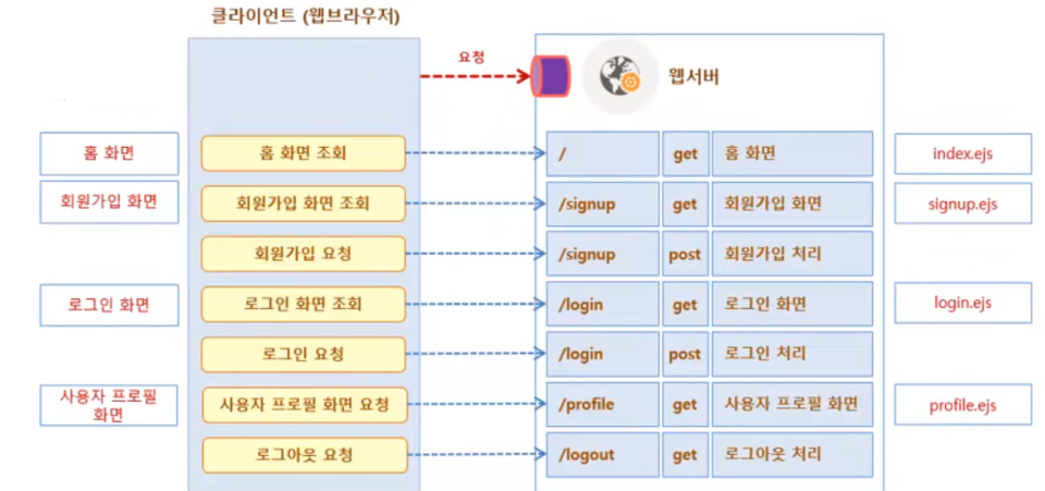 - 위 그림은 로그인과 회원 가입을 위해 필요한 뷰와 라우팅 함수들이다.