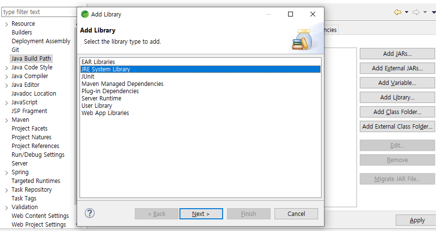 이클립스를 실행했을 때 위와 같은 에러가 발생했다. 프로젝트를 익스플로러에 오픈으로 열었는데 발생했다. 이유는 JDK와 JRE가 설치되어 있는 환경에서 프로젝트의 JRE가 PC에 설치된 JRE 폴더의 VM을 참조해서..