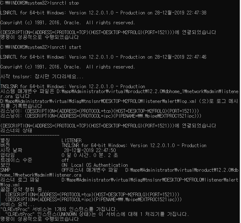 - 그 후 명령 프롬프트를 관리자 권한으로 실행한 다음 lsnctl stop과 lsnctl start가 정상적으로 작동되면 정상적으로 리스너가 생성되었음을 확인할 수 있게 된다.