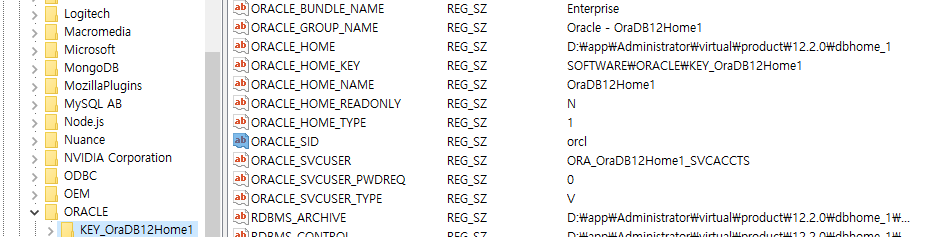 - 경로는 \HKEY_LOCAL_MACHINE\SOFTWARE\ORACLE\KEY_OraDB12Home1를 찾아 들어가면 된다.