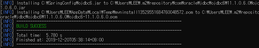 - 설치가 완료된 후에는 아래의 명령을 입력해 위에서 미리 다운로드받아둔 ojdbc6을 maven을 통해 설치한다.
