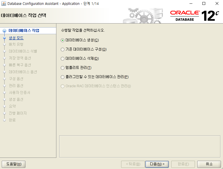 - 이들 방법을 사용했음에도 여전히 서비스에 OracleService(SID이름)의 이름으로 된 서비스가 생성되지 않아 답답했던 차에 명령프롬프트에 dbca를 입력한 후 데이터베이스를 생성하면 될 수도 있다는 것을 알게 되었다.