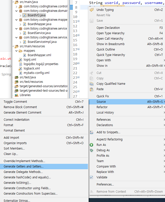 - 코드 중 아무 부분이나 선택 후 위 사진과 같이 들어간 다음 원하는 변수들을 선택해 generate해주면 빠르게 Getter와 Setter가 정의되게 된다.