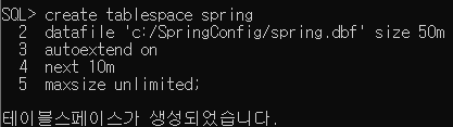 - 이후 아래의 명령을 차례로 진행해 TableSpace를 생성한다.