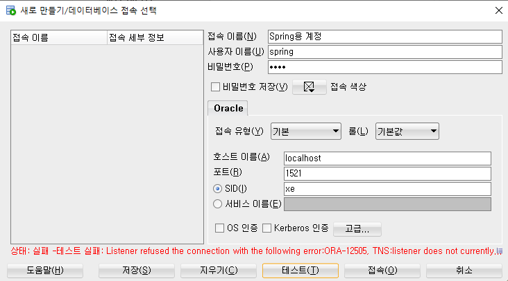 - ORA-12505오류가 발생한 모습. 알아보니 SID값이 현재 컴퓨터에서와 접속하고자 하는 값이 틀렸기 때문이었다는 것을 알 수 있었다.