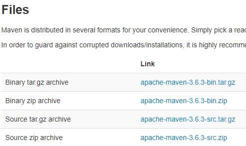 - http://maven.apache.org/download.cgi 왼쪽의 링크로 들어간 후 자신의 운영체제에 맞는 파일을 찾아 다운로드 받은 다음 원하는 위치에 압축을 풀어놓는다.