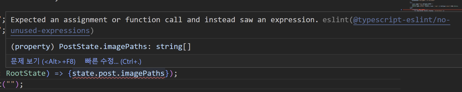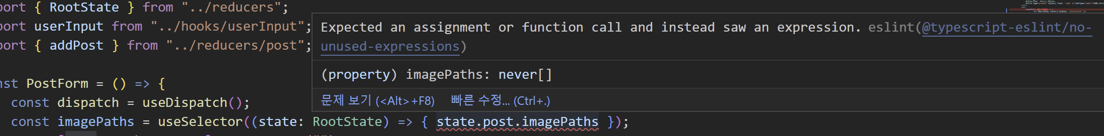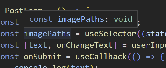 useSelector 콜백 함수에 대한 redux 공식 사이트의 문서를 확인하며 오류의 원인을 분석해본 결과 imagePaths state를 불러올 때 중괄호로 묶는 실수로 인해 컴파일러가 state.post.imagePaths의 값을 직접 반환하지 못하게 되고 중괄호로 인해 발생한 함수 블록에 반환값이 없으니 컴파일러는 암시적으로 반환값을 undefined(void유형)으로 인식했다는 것을 알 수 있었습니다.