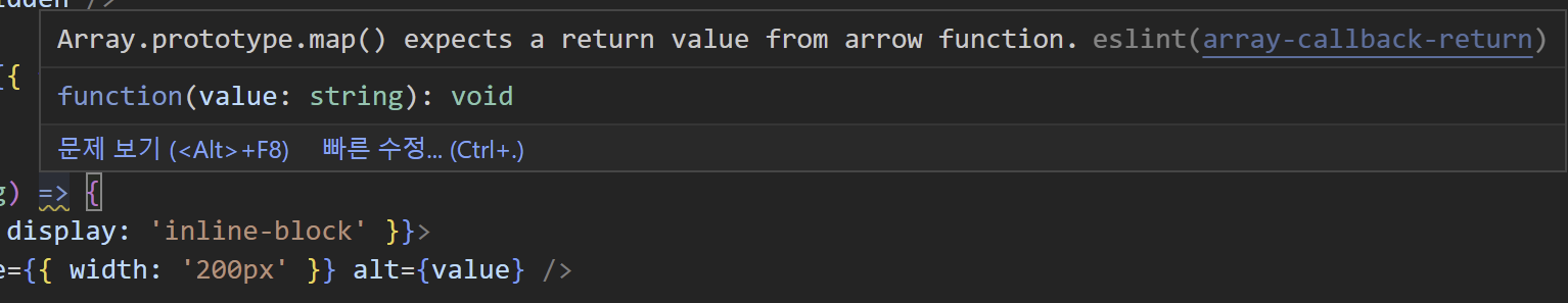 조금만 더 익숙해진 상태였다면 오류 메시지가 뜻하는 바를 곧바로 깨닫고 불필요한 부분에 대한 조사를 덜 진행했겠지만 이번 케이스를 조사하며 화살표 함수에 중괄호를 이용해 묶을 경우 리턴값을 지정해주지 않으면 예상치 못한 오류가 발생해 헤맬 수밖에 없다는 것을 알 수 있었습니다.